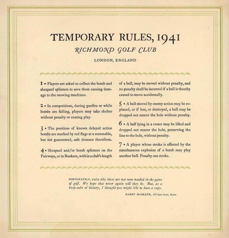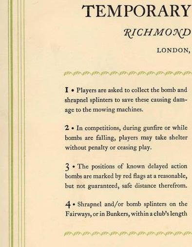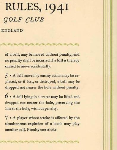 ed: “In competitions, during gunfire or while bombs are falling, players may take shelter without penalty or ceasing play.” Players were also instructed to pick up shrapnel fragments to prevent damage to the mowing machines and were even allowed to play another ball if their stroke was “affected by the simultaneous explosion of a bomb.”