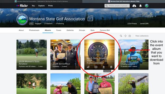 Step 1: Look in the upper right hand corner of the Montana State Golf Association Homepage The far right icon goes to Flickr, the platform used to store all of the MSGA's photos from various events throughout the year. Click on the Flickr icon.