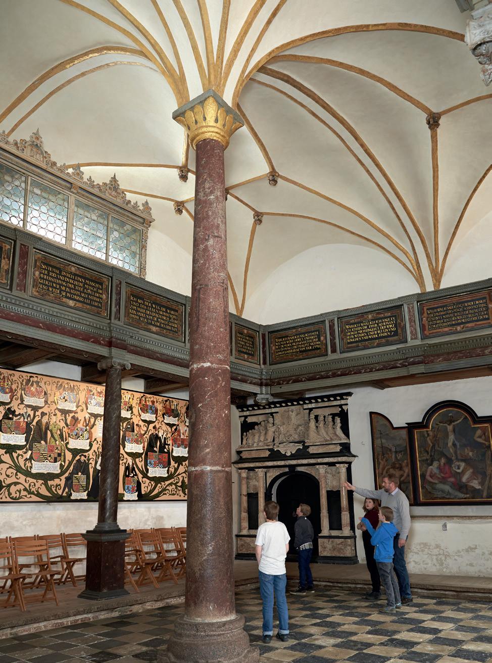 I sin 800 år lange historie har Sønderborg Slot været hjem for konger og hertuger. Ydermurene og tårnet er fra middelalderen. I 1550’erne gik Christian 3. og dronning Dorothea i gang med en stor ombygning, som skabte det nuværende slot. Selve bygningen med dens trappetårne, den store riddersal og det pragtfulde renæssancekapel er fra deres tid. Deres søn Hans den Yngre, som er stamfar til den nuværende kongeslægt, arvede slottet efter dem. Hertug Hans er sammen med sin første kone og deres 14 børn afbildet på det pragtfulde epitafium (mindetavle) ved indgangen til gravkapellet. Læg også mærke til de smukke anetavler i kirkerummet.