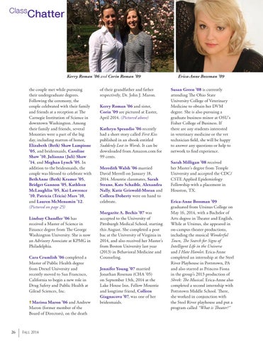 Kerry Roman ’06 and Corin Roman ’09 the couple met while pursuing their undergraduate degrees. Following the ceremony, the couple celebrated with their family and friends at a reception at The Carnegie Institution of Science in downtown Washington. Among their family and friends, several Mounties were a part of the big day, including matron of honor, Elizabeth (Beth) Shaw Lampione ’05, and bridesmaids, Caroline Shaw ’10, Julianna (Juli) Shaw ’14, and Meghan Lynch ’05. In addition to the bridesmaids, the couple was blessed to celebrate with BethAnne (Beth) Kramer ’05, Bridget Gannon ’05, Kathleen McLaughlin ’05, Kai Lawrence ’10, Patricia (Tricia) Mars ’10, and Lauren McMenamin ’12. (Pictured on page 25) Lindsay Chandler ’06 has received a Master of Science in Finance degree from The George Washington University. She is now an Advisory Associate at KPMG in Philadelphia. Cara Crumlish ’06 completed a Master of Public Health degree from Drexel University and recently moved to San Francisco, California to begin a new role in Drug Safety and Public Health at Gilead Sciences, Inc. Marissa Maron ’06 and Andrew
