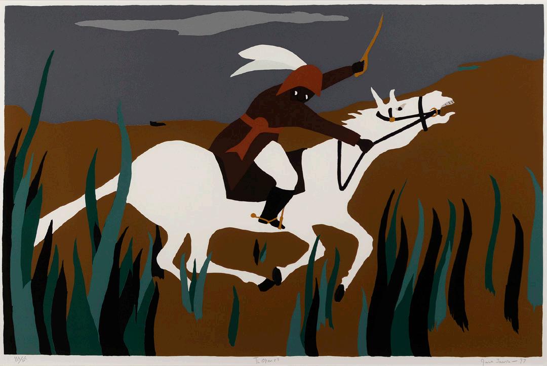 18-3/8 x 28-7/8 inches (image) 22-1/4 x 32-1/4 inches (sheet) signed, titled, dated, and numbered 70/120 L96-6 This print is based on the thirty-first image from the original series of 41 paintings of The Life of Toussaint L' Ouverture. (Nesbett, 82)