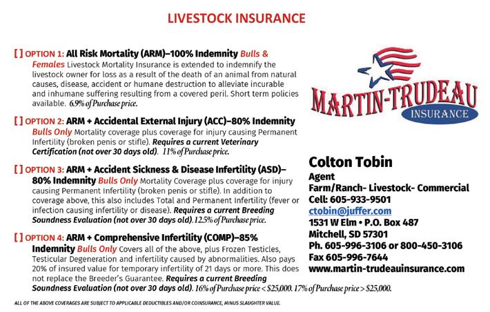 Free trucking in SD and the first 500 miles is free. Also free trucking for purchases of 5 or more head. $100 off per bull if you pick them up sale day.