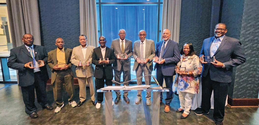 The founders of MSOE’s National Society of Black Engineers (NSBE) Chapter were honored with the DEIB Legacy Award on May 10. Pictured from left: Keith Crawford ’82, Marcellus Cruthird ’83, Andre Ash ’82, Tim Settle ’82, Perry Bishop ’82, Ernest Simons ’82, William Briggs ’82, Dr. Jackie-Herd Barber ’84 and Dr. Michael Barber ’82.