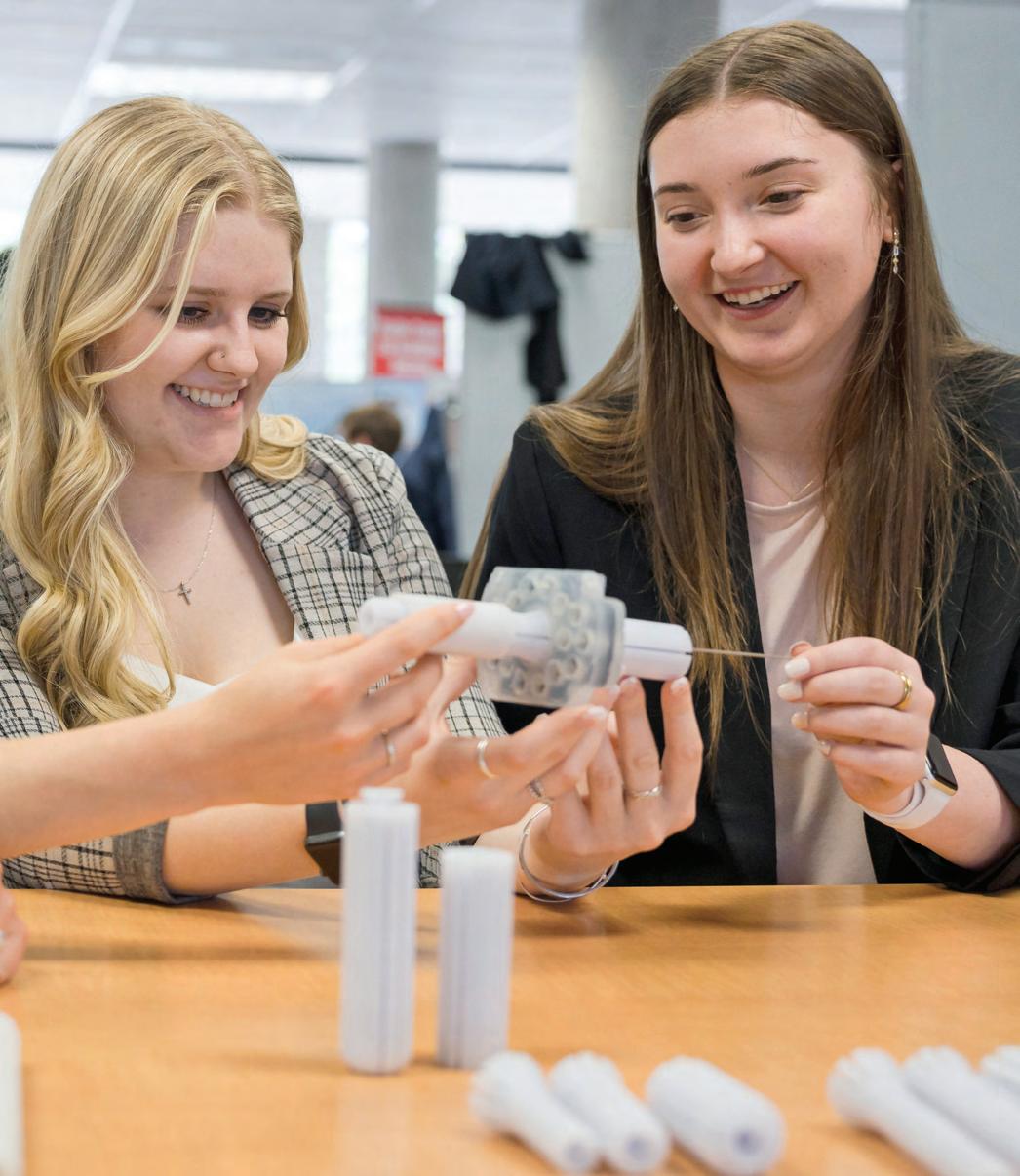 Seniors Jordyn Sievert (left) and Emma Braun worked with their senior design team to develop a customizable brachytherapy device for cervical cancer patients.