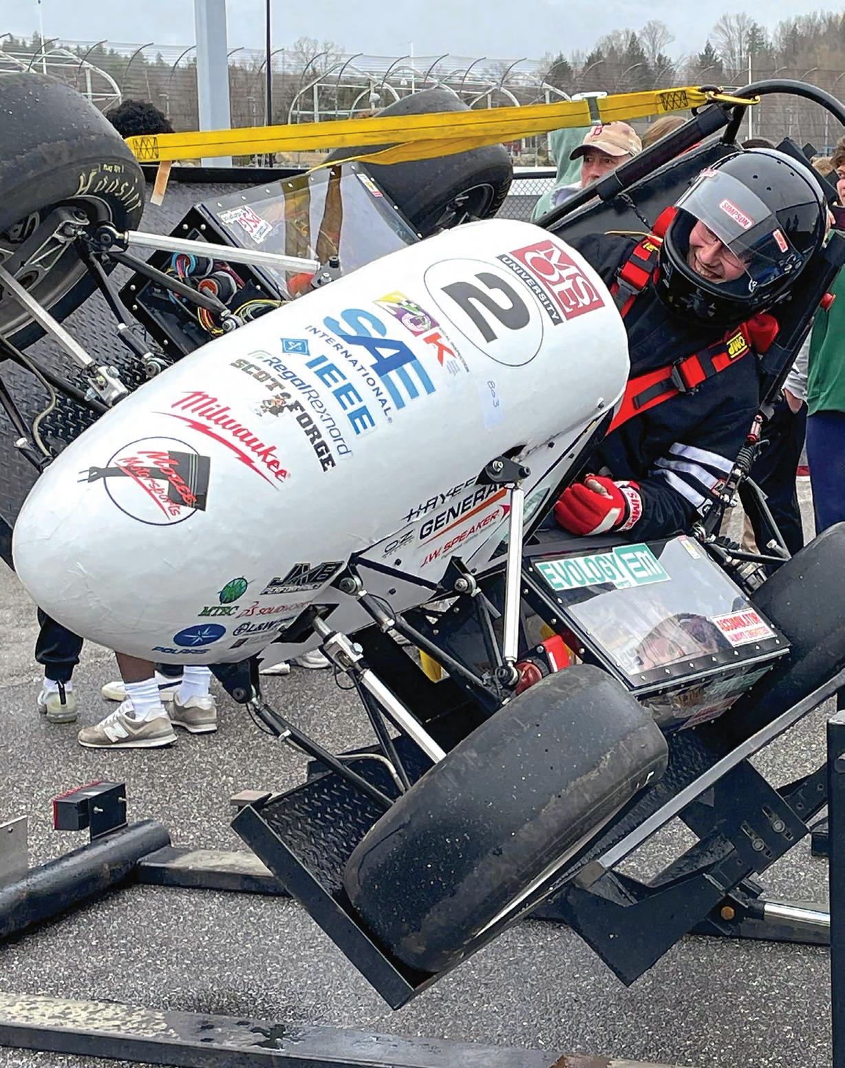 Mozee Motorsports took first place in the hybrid vehicle category at the 2024 SAE Formula Hybrid + Electric competition at the New Hampshire Motor Speedway. This marks their third world championship. Thirty-two teams attended and Mozee Motorsports was the only hybrid team that passed 100% of the inspections including the tilt test, pictured here. They also were awarded first in project management and second in design. Teams must submit technical reports and go through a series of judging and inspections at the speedway. The vehicles are then tested on a 1.6-mile full road course.