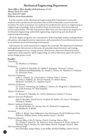 Mechanical Engineering Department Main Office: Allen-Bradley Hall of Science, S-110 Phone: (414) 277-7375 Fax: (414) 277-2222 Website: www.msoe.edu/me It is the mission of the Mechanical Engineering (ME) Department to provide students with a professional education that is both technically current and well rounded. We strive to prepare our students for professional careers in engineering or engineering technology, and to instill in them an awareness of professional and social responsibility. The ME Department offers four-year baccalaureate degrees in mechanical engineering, industrial engineering, engineering and mechanical engineering technology. All of the degree programs are committed to delivering high-quality undergraduate education, stressing laboratory experiences and preparation for professional practice in an intimate, personal learning environment. Laboratories are used extensively to support the curricula. The department maintains undergraduate laboratories in the areas of materials characterization and testing, manufacturing processes, energy systems, fluid power, electromechanical systems, ergonomics and computer-aided engineering, as well as laboratory space devoted to senior design project work.