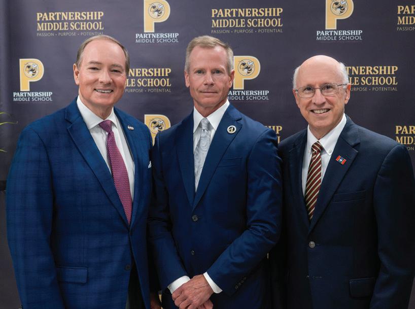 ABOVE: Mississippi State and Starkville Oktibbeha Consolidated School District representatives celebrate a new partnership for a cutting-edge high school to be built on the MSU campus. From left are MSU President Mark E. Keenum, SOCSD Superintendent Tony McGee and MSU Provost and Executive Vice President David Shaw. (Photos by Emily Grace McCall)