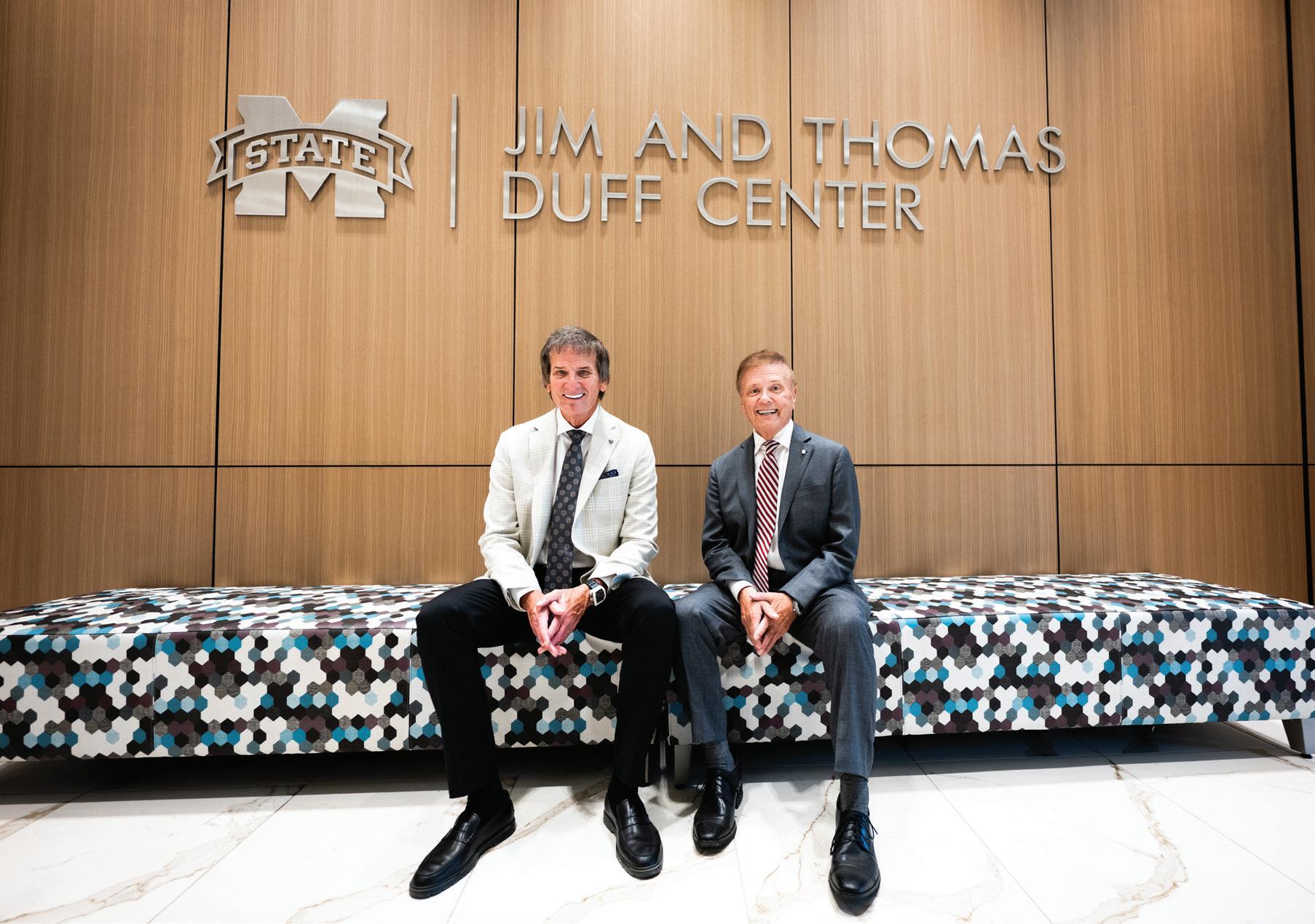 Jim (left) and Tommy Duff sit in the lobby of the newly dedicated Jim and Thomas Duff Center. One of the largest academic buildings on MSU’s campus, it unites under one roof the Department of Kinesiology and key programs of the Mississippi Institute on Disabilities–including the Autism and Developmental Disabilities Clinic, ACCESS Program, and Specialized College Services—creating