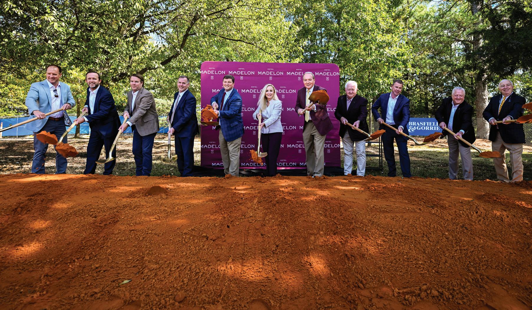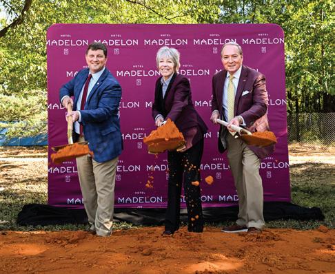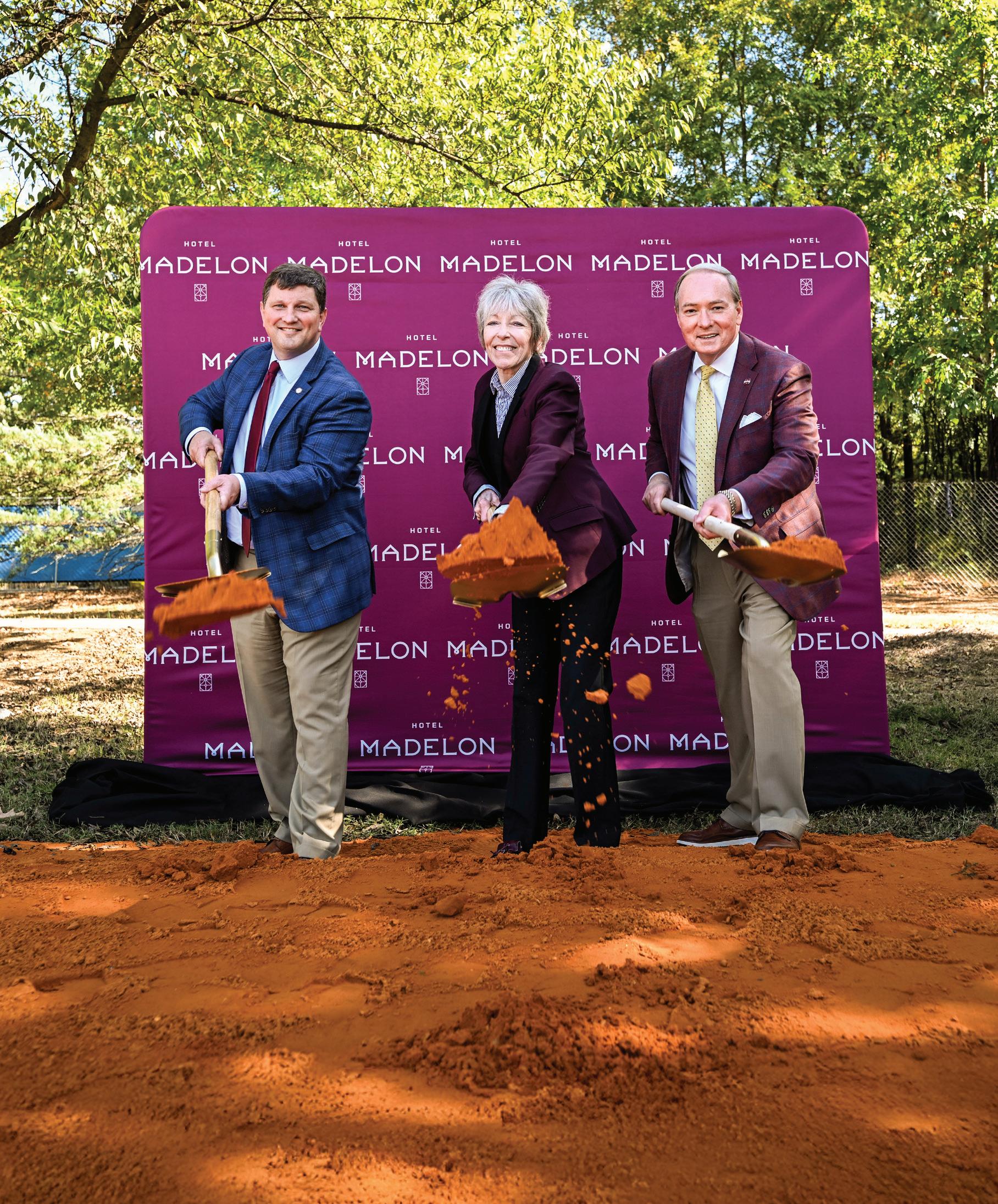 From left, MSU Foundation President and CEO John Rush, Starkville Mayor Lynn Spruill and MSU President Mark E. Keenum celebrate the groundbreaking of Hotel Madelon, a 122-room Marriott Tribute Portfolio hotel anchoring the new Crossroads District between campus and the Cotton District. Photo by Grace Cockrell