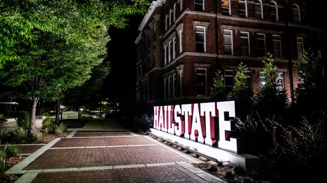 3) A lighted Hail State installation provides an iconic centerpiece to Old Main Plaza.