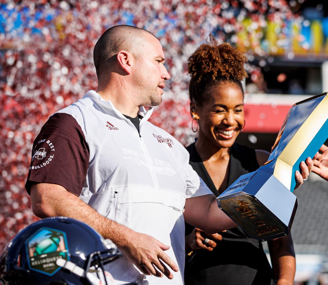 Carrying a “Mike” flag in honor of late head coach Mike Leach, quarterback Will Rogers leads the Bulldogs onto the field at the ReliaQuest Bowl Jan. 2. The Dawgs took down the Fighting Illini of the University of Illinois in a 19-10 victory, ending the season with a 9-4 record.