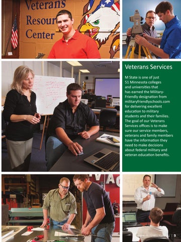Veterans Services M State is one of just 51 Minnesota colleges and universi es that has earned the MilitaryFriendly designa on from militaryfriendlyschools.com for delivering excellent educa on to military students and their families. The goal of our Veterans Services oďŹƒces is to make sure our service members, veterans and family members have the informa on they need to make decisions about federal military and veteran educa on benefits.
