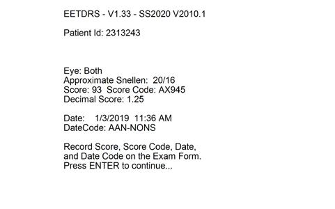 • Export test results automatically in an XML or CSV format to any EDC or Reading Center for immediate access to statistical analysis - Results indicate ETDRS numerical score, visual acuity level, and logMAR value