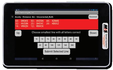 ® Automated E Testing at Distance, Intermediate and N Tablet Controller Sample test result RETURN TO TABLE OF CONTENTS VISUAL ACUITY M&S | Clinical Trial Suite CTS Recognized by the FDA for use in all phases of Clinical and PMA Trials FEATURES 1-877-225-6101 1-847-763-0500 mstech-eyes.com Software development in USA The First Choice in Vision Testing Systems ©2022 M&S and Smart System are registered trademarks of the Hilsinger Company Parent LLC. All rights reserved. The Hilsinger Company Parent LLC holds US Patents 7,354,155; 7,926,948; 8,425,040; 8,167,429; 8,419,184; 8,550,631; 8,992,022; 9,433,347; 9,820,644; 10,244,938 and 10,182,713. Other Patents Pending. YEARS