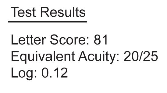 Volume 6, April 2018 Test Results Letter Score: 81 Equivalent Acuity: 20/25 Log: 0.12