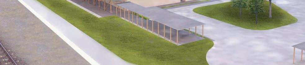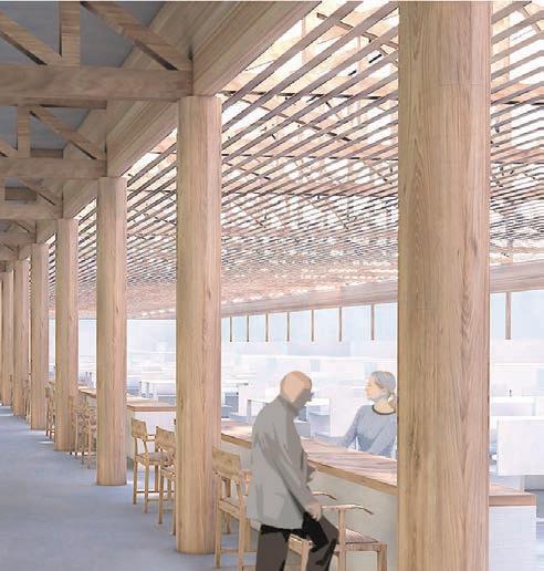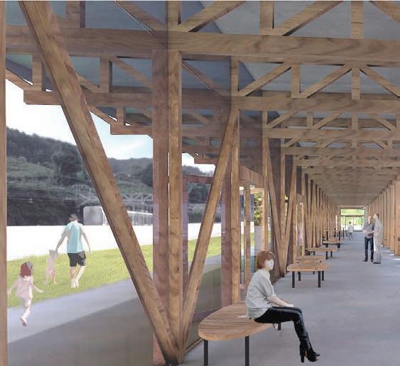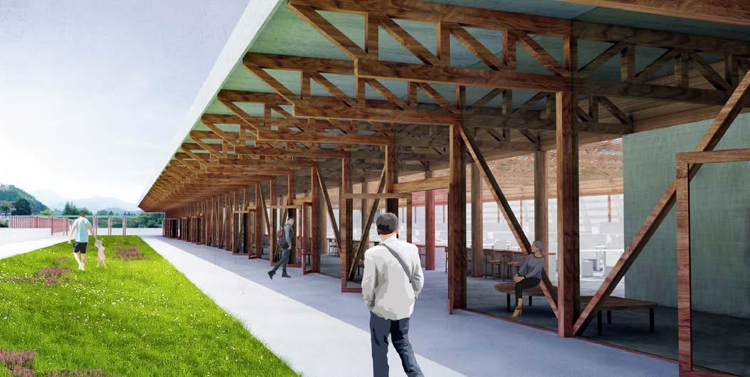 The arcade made from locally produced wood connects the building to parking lots, bus rotary, and existing building, ensuring easy access for the visitors without blocking ����lines due to winter snow.