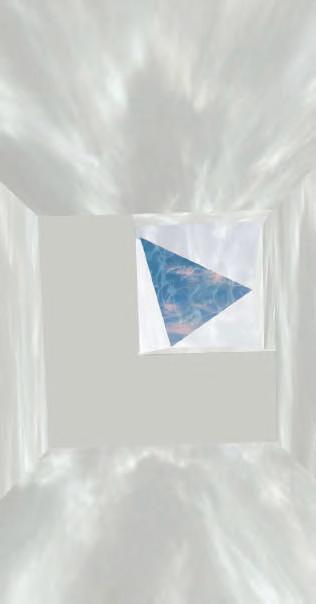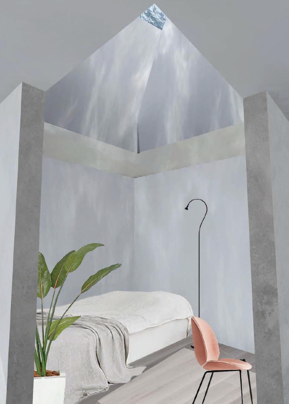 Water waves are reflected on the walls as the weather changes. In rainy day, rain drops reflects on the room and the room resonates with sound. The color of the room changes with the sky and the wether.