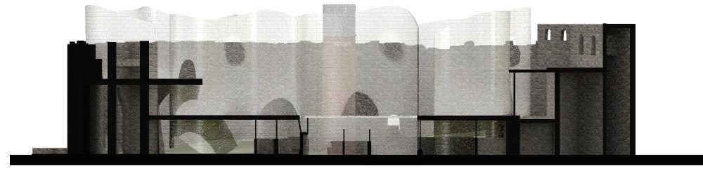 height, housing the programmatic elements at various elevations around the fortress. Respecting the material history of the fortress, the glass block adds a new layer on top of its deep legacy (limestone, brick, stone), aimed not to complete the project but serve as a new foundation for the future.