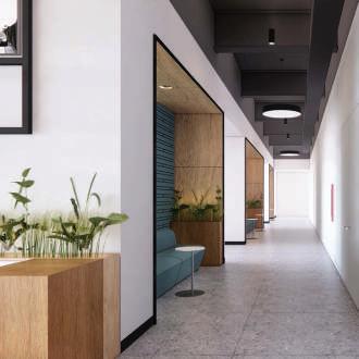 The central corridor is a highly visible window / waiting lobby and is a one-stop window.