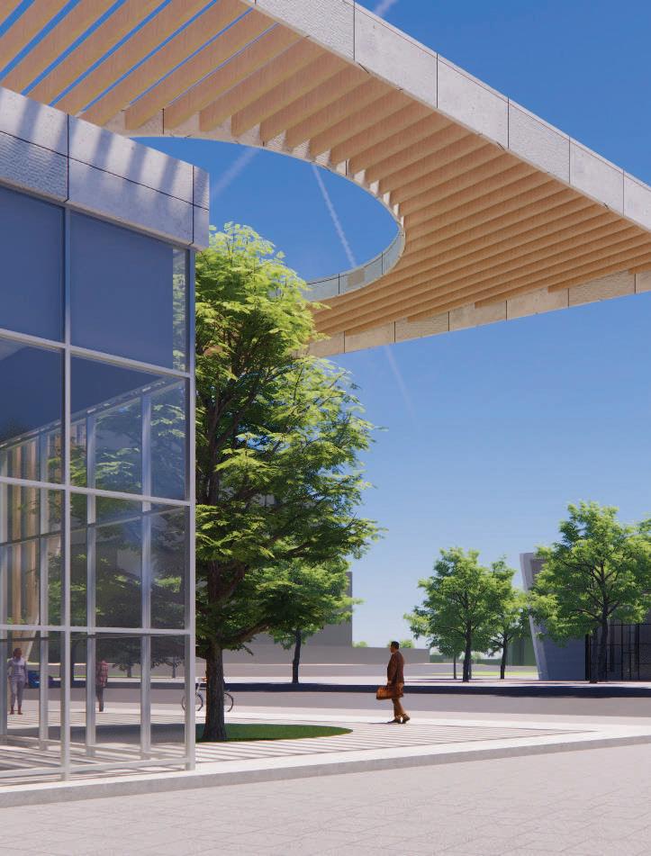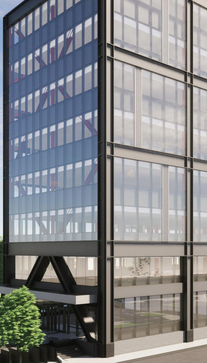 In the design of the building facade/envelope, distinctive features are employed to create a unique architectural expression. These features include single columns strategically positioned at the building’s corners, a double-bay glass arrangement that imparts a sense of openness and transparency, and cross bracing discreetly positioned behind the glass, enhanced with frit to optimize visibility