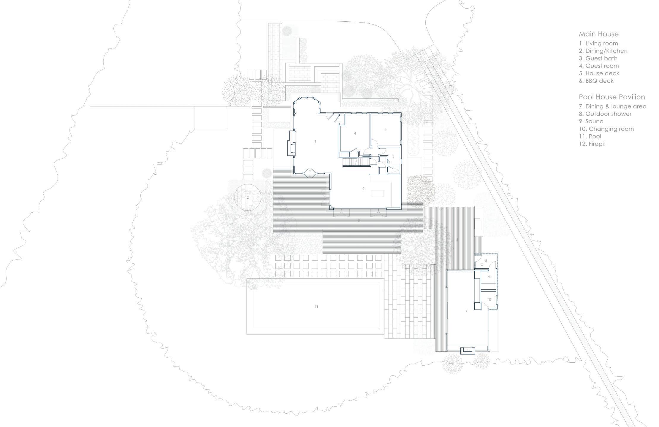 Pool Pavilion & Interior renovation project in East Hampton, NY. The pavilion is a ground-up project for a summer pool house, next to the main house, connected by deck. Interior renovation in the main house has been completed. The placement of the plants was planned in collaboration with a landscape designer to connect the deck, pavilion, and main house.
