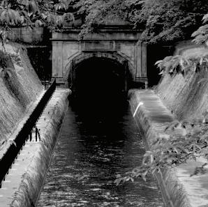 It shows the place where water from Lake Biwa exists. Water flow in the site starts from the top of Keage-Incline’s slope. Small waterfall at the lower part of Keage-Incline suddenly appears on the ground level, flowing through a culvert located below the passage space. As you walk through the passage under the Keage-Incline slope, you physically feel the blocked water-flow line is connected to the waterfall.