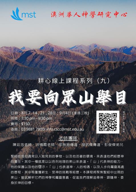 第九次的耕心線上課程系列將於下半年開 辦,此次的課程是關於「山」,課程名稱 為「我要向眾山舉目」,定在8月7,14,