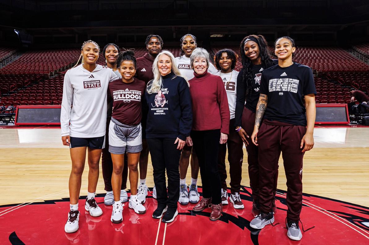 Karen McCord and Lynn Spriull celebrate with the women’s basketball team following an SEC road win at Arkansas. (Photo: Jaden Powell, MSU Athletics)
