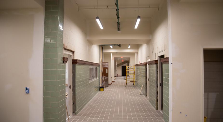 development suite, test kitchen, classroom space, dean and executive suites, student organization rooms and a prospective student reception area. While the modern amenities will greatly improve Ballew’s functionality, a few tributes to the past remain. Apart from the green tiles that still adorn many of the first floor’s walls, the track used to transport livestock specimens from room to room is still on the ceiling as a tribute to the building’s former use. Additionally, an original building room and office directory remains just inside the front door. If you were wondering, “smoke room” does not refer to smoking meat.
