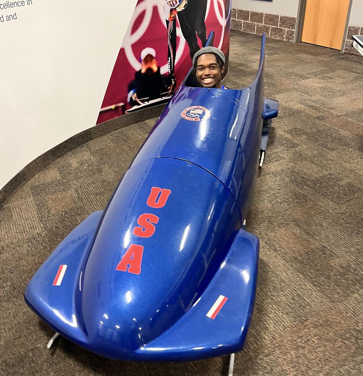 Jace Johnson sits in a Team USA bobsled, 2023. Johnson's Olympic dream began as a child, and he is pursuing his passion after graduating from MSU.