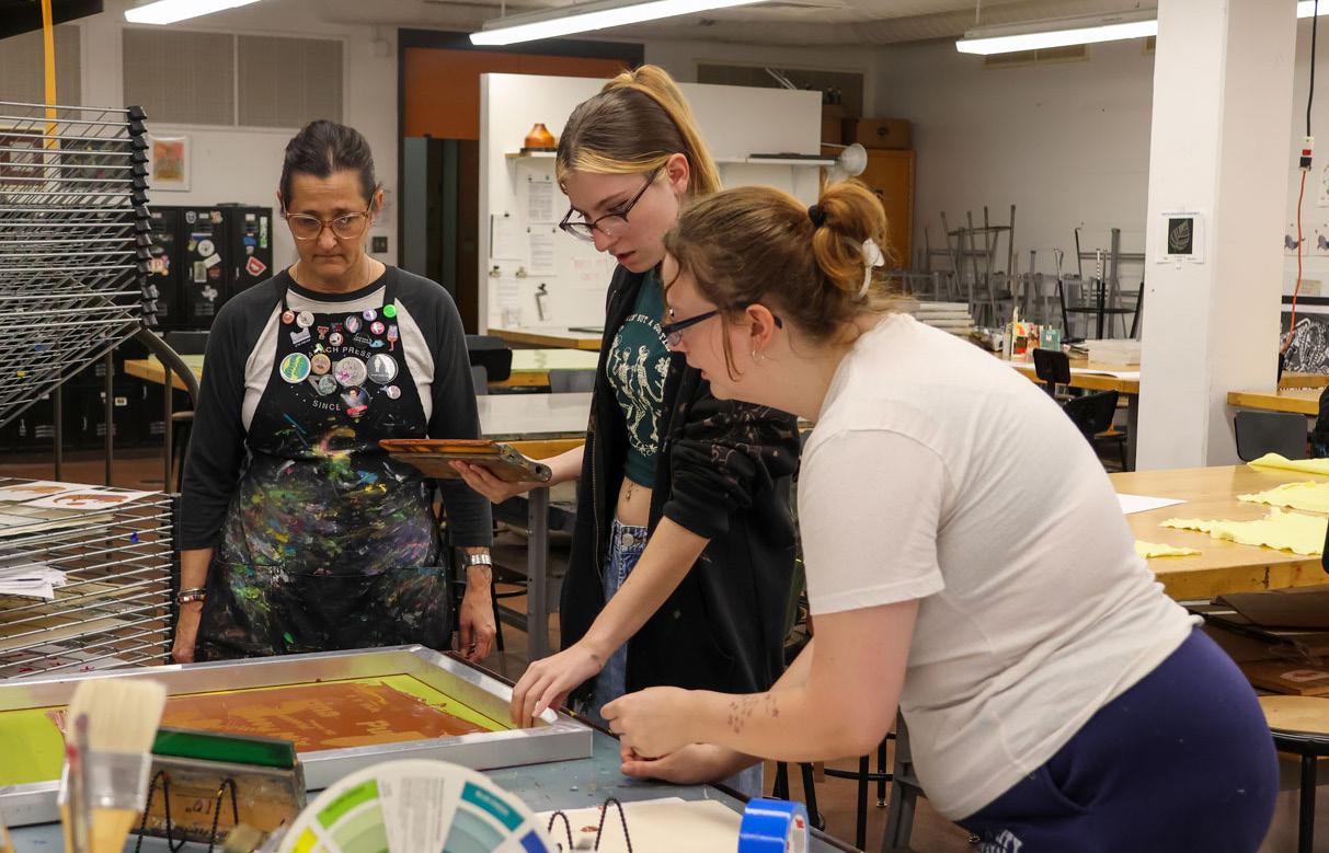 With its “post-electric” setting, Scoggins decided to collaborate with the art department to get unique designs printed on fabric for two of the costumes. With the help of art professor Catherine Prose and art juniors Hailey Padilla and Jess Zimny, Scoggins used screen printing to help make unique fabrics for the show.