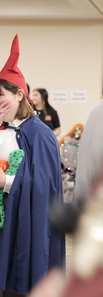 adults, and parents queuing up to attend the event. The atrium was filled with costumes and a pop of color as the attendees piled in to visit each of the tables that the or ganizations on campus set up for the event.