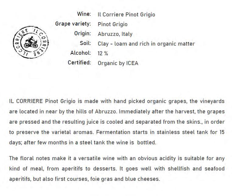 PINOT GRIGIO – Loaded with an intense, ample and persistent bouquet of fresh fruit and flowers, the taste is delicate and elegant, that is well-balanced by aromas of ripe fruits like golden apple and tropical fruits. Enjoy with seafood, poultry, pasta dishes, or on its own.