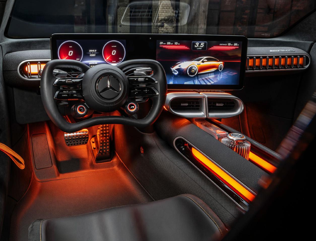 Inside, the Concept AMG GT XX offers a motorsport-inspired cockpit. Highlights include LABFIBER biotech leather - which consists of a combination of recycled rubber from recycled AMG GT3 race tyres, vegetable proteins and biopolymers. Also here are bio-engineered silk door pulls. Along with carbon-fibre rear seats, 3D-printed ergonomic seat cushions, and