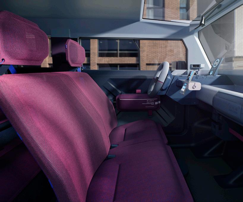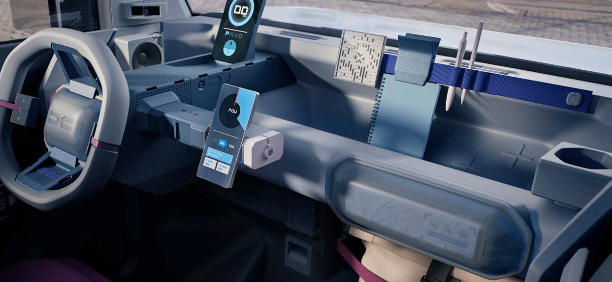 windows and a near-vertical windscreen, while lightweight, mesh-fabric seats and sliding side windows reduce cost and complexity. The dashboard incorporates Dacia’s YouClip system, allowing owners to customise the cabin with accessories like