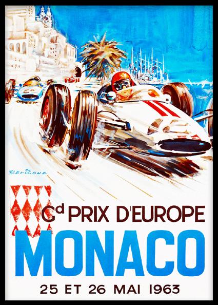 recreate the thrill of the race, there's a splash of colour, retro-style fonts . . . they just look cool. This poster, reflecting the Monaco Grand Prix of 1963, looks a winner. Printed on matte premium and age-resistant paper, the print is available in two sizes: 30cm x 40cm, and 50cm x 70cm.