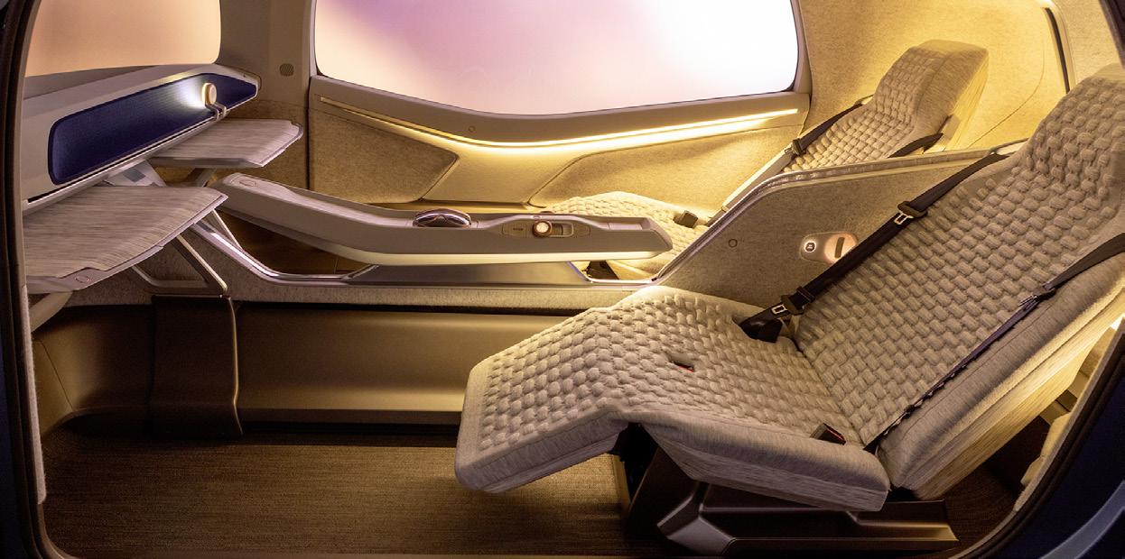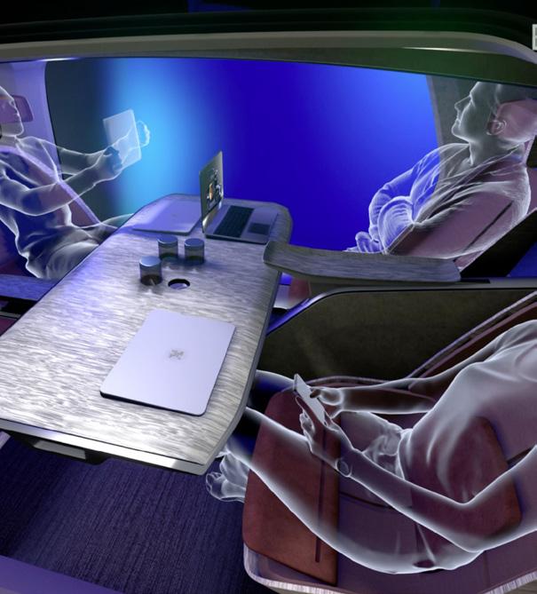 A modular interior concept can be customised for each journey and booked as a Mobility-as-a-Service offering. Depending on the configuration, up to four people can be transported. For business trips, a conference setup offers four seats and a large table in the middle. A configuration in the overnight setup allows the conversion of two seats into two beds that can be folded out to a full-flat position.