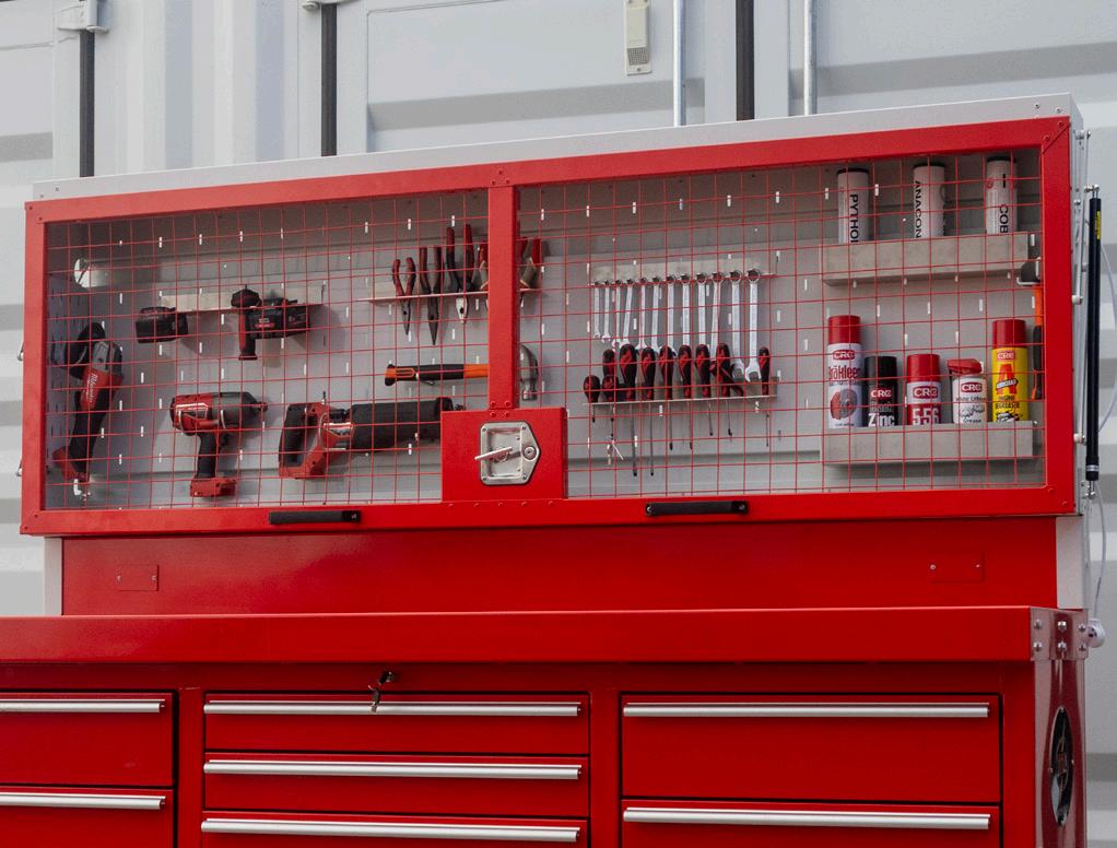 Lockable Shadow Board, comes with lights pre-installed, cables & plugs! Made with durable construction steel and removeable mounts so you can use recessed channels to mount onto a wall. * Does not come with Workbench | Accessories sold separately.