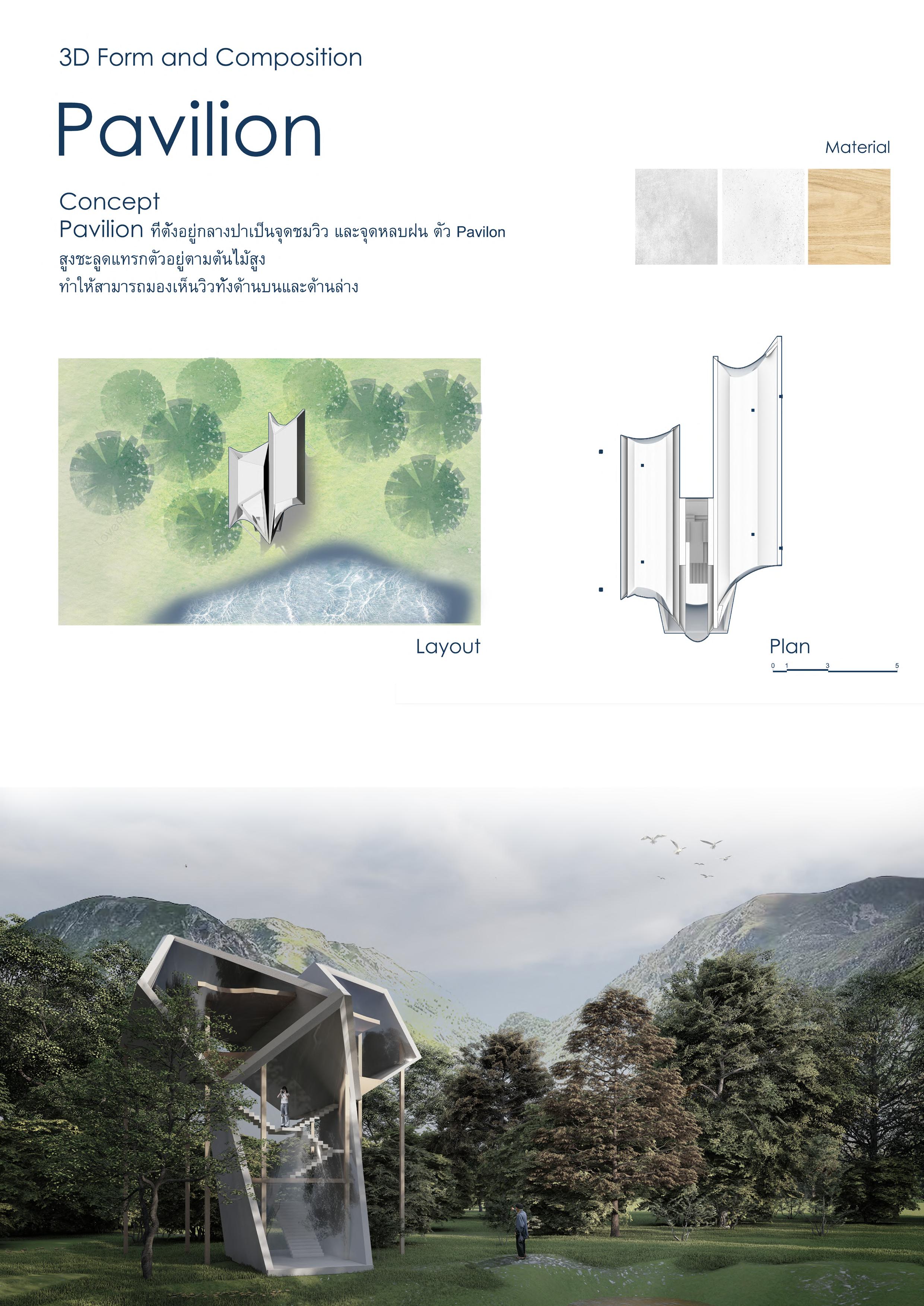 The pavilion located in the middle of the forest is a viewpoint and shelter from the rain. The pavilion has a towering height nestled in the tall trees to see views both above and below.