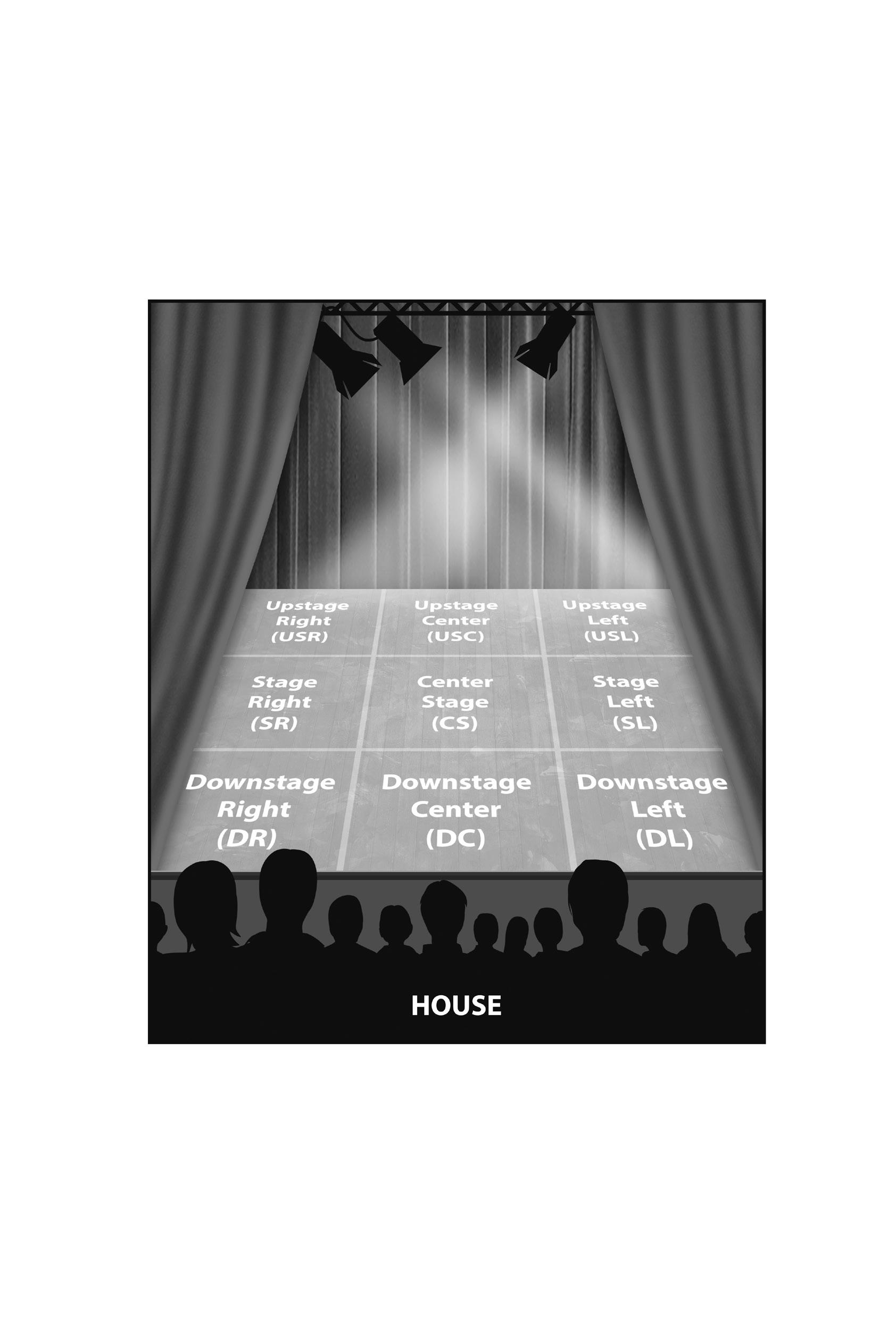Congratulations! You’ll be working with your creative team and fellow cast members to put on a musical. Before you begin rehearsals, there are some important things you should know. This book is your script. Whether putting on a school production or rehearsing a professional show, every actor, director, and stage manager works from a script. Your Actor’s Script contains additional information for this musical, like this introduction and two glossaries. You can look up any bold words in the Actor’s Glossary at the back of this book. Be sure to take good care of your script and take notes with a pencil since what you’ll be doing onstage can change during rehearsals. One of the first things you’ll need to learn is what to call the various areas of the stage. Since most stages used to be raked, or tilted down toward the house where the audience sits, the term downstage is still used to refer to the area closest to the audience, and upstage is used to refer to the area farthest from the audience. Stage left and stage right are from the actor’s perspective when facing the audience. This diagram shows how to use these terms to label nine different parts of the stage.