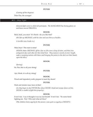 (HOOK shakes MICHAEL off his claw as if he were a drop of water, and these two antagonists face each other for their final bout. They measure swords at arms’ length, make a sweeping motion with them, and bringing the points to the deck rest their hands upon the hilts.) (Jeering)