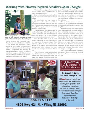 Working With Flowers Inspired Schaller’s Spirit Thoughts “What could be more joyous than the vibrant array of beautiful flowers, all different and all unique, just like each person?” It was at that time, she says, “the Holy Spirit began to inspire me to minister to people through flowers.” The shop became not only a place to buy blooming beauties, but also presented an opportunity for people to share their hurts and joys. These experiences were wonderful stepping stones, Patricia says, to assist in the devotional writings of Spirit Thoughts. “The inspiration of these writings came to me through a nudging of the Holy Spirit. At first, I wasn’t convinced to write these messages on “We were designed to have our own distinct looks and paper, but as I began to write, the Spirit compelled talents. We need to embrace and display our special me to continue and share them with others.” Spirit Thoughts started out as an e-mail gifts,” says Patricia Schaller, author of Spirit Thoughts. message to just a few and then began to spread Patricia Schaller’s daily devotional, Spirit to a large number of recipients, many of whom Thoughts, was published in December of 2008. expressed a desire to have it in book form. A wife, mother and grandmother, Patricia Readers will be drawn in and delighted by the describes her past careers as “important tools” in adventures with biblical references in a downleading her to the inspiration for these writings. to-earth, easy-to-comprehend manner, Patricia She had a background in sales, marketing and says. financial planning when, in 1985, she began to “The responses of many individuals have design flower arrangements. In 1989, she moved been that the stories related in these devotionals to Boone with her husband Roger and opened a reached their hearts, touched their spirits, and flower shop called Heaven Scent Flowers. made them anxious to read on through the