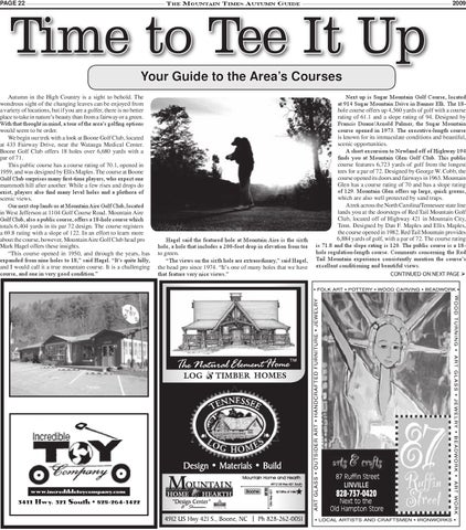 Next up is Sugar Mountain Golf Course, located at 914 Sugar Mountain Drive in Banner Elk. The 18hole course offers up 4,560 yards of golf with a course rating of 61.1 and a slope rating of 94. Designed by Francis Duane/Arnold Palmer, the Sugar Mountain course opened in 1973. The executive-length course is known for its immaculate conditions and beautiful, scenic opportunities. A short excursion to Newland off of Highway 194 finds you at Mountain Glen Golf Club. This public course features 6,723 yards of golf from the longest tees for a par of 72. Designed by George W. Cobb, the course opened its doors and fairways in 1963. Mountain Glen has a course rating of 70 and has a slope rating of 129. Mountain Glen offers up large, quick greens, which are also well protected by sand traps. A trek across the North Carolina/Tennessee state line lands you at the doorsteps of Red Tail Mountain Golf Club, located off of Highway 421 in Mountain City, Tenn. Designed by Dan F. Maples and Ellis Maples, the course opened in 1982. Red Tail Mountain provides 6,884 yards of golf, with a par of 72. The course rating is 71.8 and the slope rating is 120. The public course is a 18hole regulation-length course. Comments concerning the Red Tail Mountain experience consistently mention the course’s excellent conditioning and beautiful views. CONTINUED ON NEXT PAGE