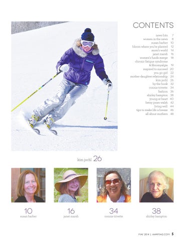 contents news bits women in the news susan barber bloom where you’re planted mom’s world janet marsh women’s funds merge chronic fatigue syndrome & fibromyalgia inspired to succeed you go girl mother-daughter relationship kim jochl by the book connie trivette fashion shirley hampton young at heart betsy jones walsh living well tips to make life a breeze all about mothers