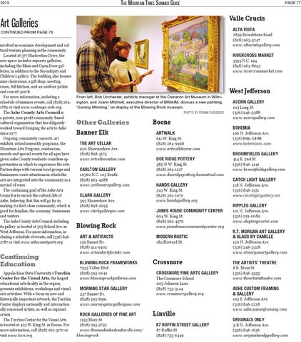 involved in economic development and cultural tourism planning in the community. Located at 377 Shadowline Drive, the new space includes separate galleries, including the Main and Open Door galleries, in addition to the Serendipity and Children’s gallery. The building also houses nine classrooms, a gift shop, meeting room, full kitchen, and an outdoor pickin’ and concert porch. For more information, including a schedule of summer events, call (828) 2641789 or visit www.watauga-arts.org. The Ashe County Arts Council is a private, non-profit community-based cultural organization that has diligently worked toward bringing the arts to Ashe since 1977. Ongoing community concerts, art exhibits, school assembly programs, the Mountain Arts Program, residencies, murals and special events for all ages have given Ashe County residents countless opportunities in which to experience the arts. Partnerships with various local groups and businesses create situations in which the arts are integrated into the community in a myriad of ways. The continuing goal of the Ashe Arts Council is to enrich the cultural life of Ashe, believing that this will go far in making it a first-class community, which is good for families, the economy, businesses and visitors. The Ashe County Arts Council, including its gallery, is located at 303 School Ave. in West Jefferson. For more information, including a schedule of events, call (336) 8462787 or visit www.ashecountyarts.org.