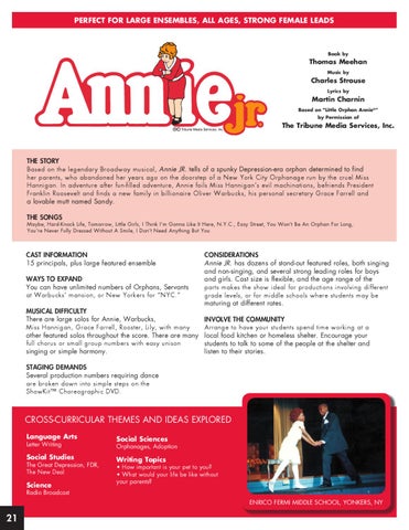 CONSIDERATIONS Annie JR. has dozens of stand-out featured roles, both singing and non-singing, and several strong leading roles for boys and girls. Cast size is flexible, and the age range of the parts makes the show ideal for productions involving different grade levels, or for middle schools where students may be maturing at different rates. INVOLVE THE COMMUNITY Arrange to have your students spend time working at a local food kitchen or homeless shelter. Encourage your students to talk to some of the people at the shelter and listen to their stories.