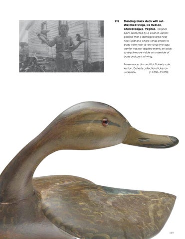 Standing black duck with outstretched wings, Ira Hudson, Chincoteague, Virginia. Original paint protected by a coat of varnish; possible that a damaged area near neck seat and where wings attach to body were reset a very long time ago; varnish was not applied evenly on body so drip lines are visible at underside of body and parts of wing.