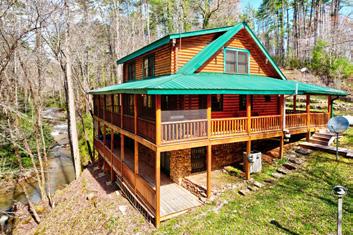 This 3 bedroom/3 bath woodland cabin features a real wood-burning fireplace, expansive decks and porches, cathedral ceilings, and granite countertops. It also includes a well-equipped mother-in-law suite.