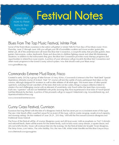 Blues From The Top Music Festival, Winter Park Some of the finest Blues musicians in the nation will gather in Winter Park for four days of live Blues music. From Thursday, June 27 through June 30th you will get your fill of incredible vocalists and some smokin’ guitar play. Better yet, all of this entertainment will assist the Blue Star Connection, a nonprofit entity that provides guitars, bass guitars, harmonicas, violins, keyboards, flutes and drum kits to children fighting cancer and other life threatening situations. In addition to the instruments they give, the Blue Star Connection provides music therapy programs and opportunities to attend live music events. A portion of your admission will go towards the Blue Star Connection and other music programs in the Grand County school system. Now that should wash your blues away! www.grandblues.org