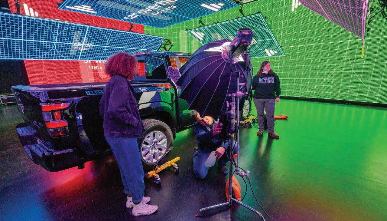 using Unreal Engine software, which causes the background to change appropriately as the camera moves, like in a video game. “I love the fact that Nashville recognizes the technology we have available here at MTSU and that it’s a benefit to the community as a whole and the music industry,” said Mike Forbes, director of technical systems for the Department of Media Arts who has taught at MTSU for 13 years.